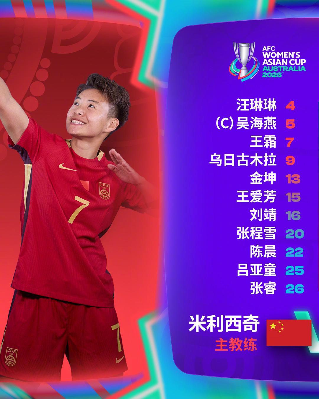 此役,中国女足主教练米利西奇安排33岁的老将吴海燕,担任场上队长,陈晨司职门将,王霜、汪琳琳、张程雪、吕亚童、王爱芳、刘靖、张睿、乌日古木拉、金坤同时首发。